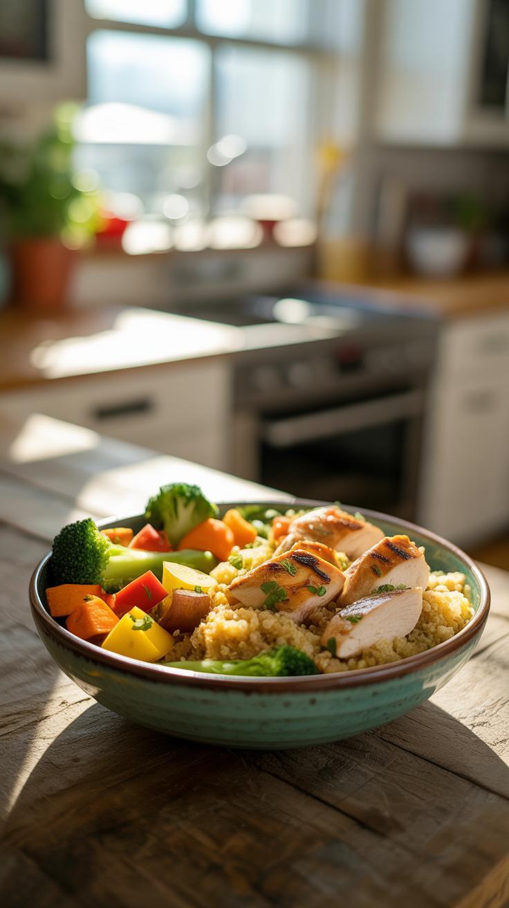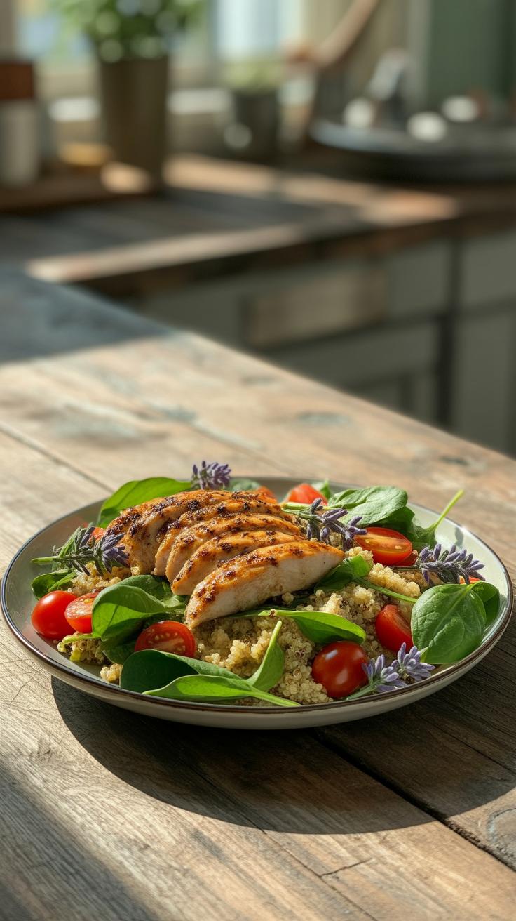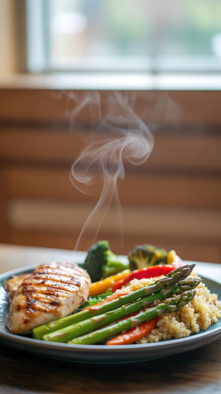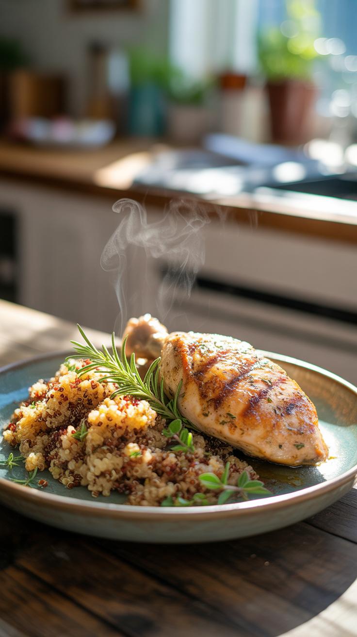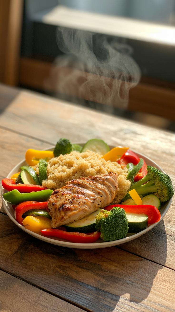 - Grilled chicken breast with quinoa and steamed vegetables—quinoa adds carbs and extra protein