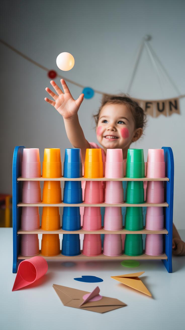 • Plastic cups: Great for stacking or ring toss bases. They’re lightweight and pretty safe.