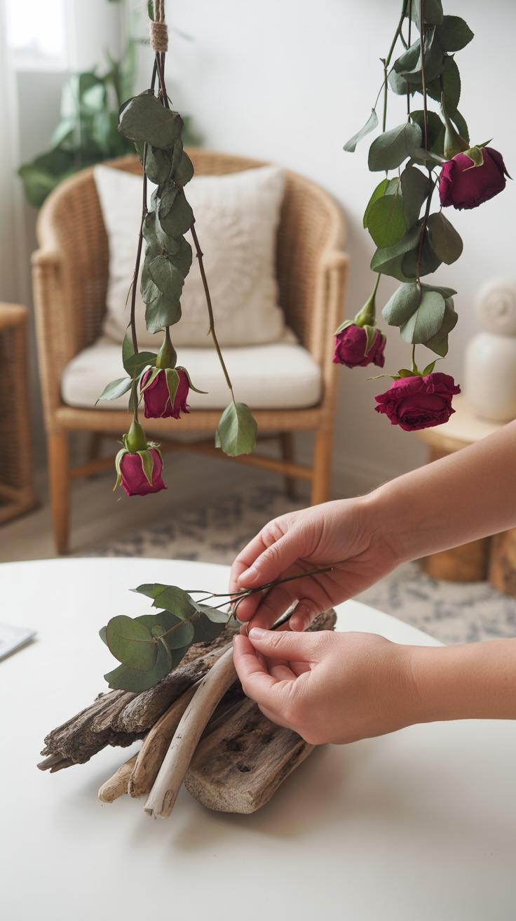 - Place dried flower hangings near textured surfaces like jute rugs or leather armchairs for a tactile feel.