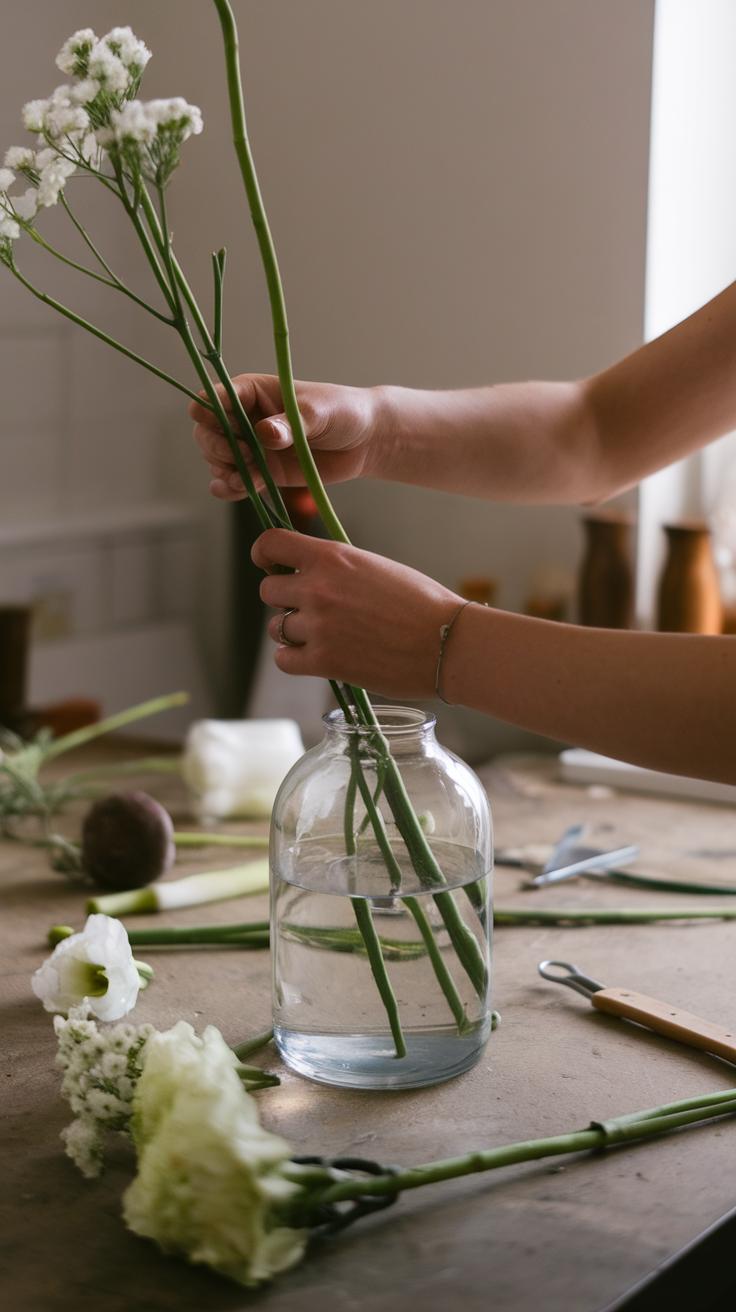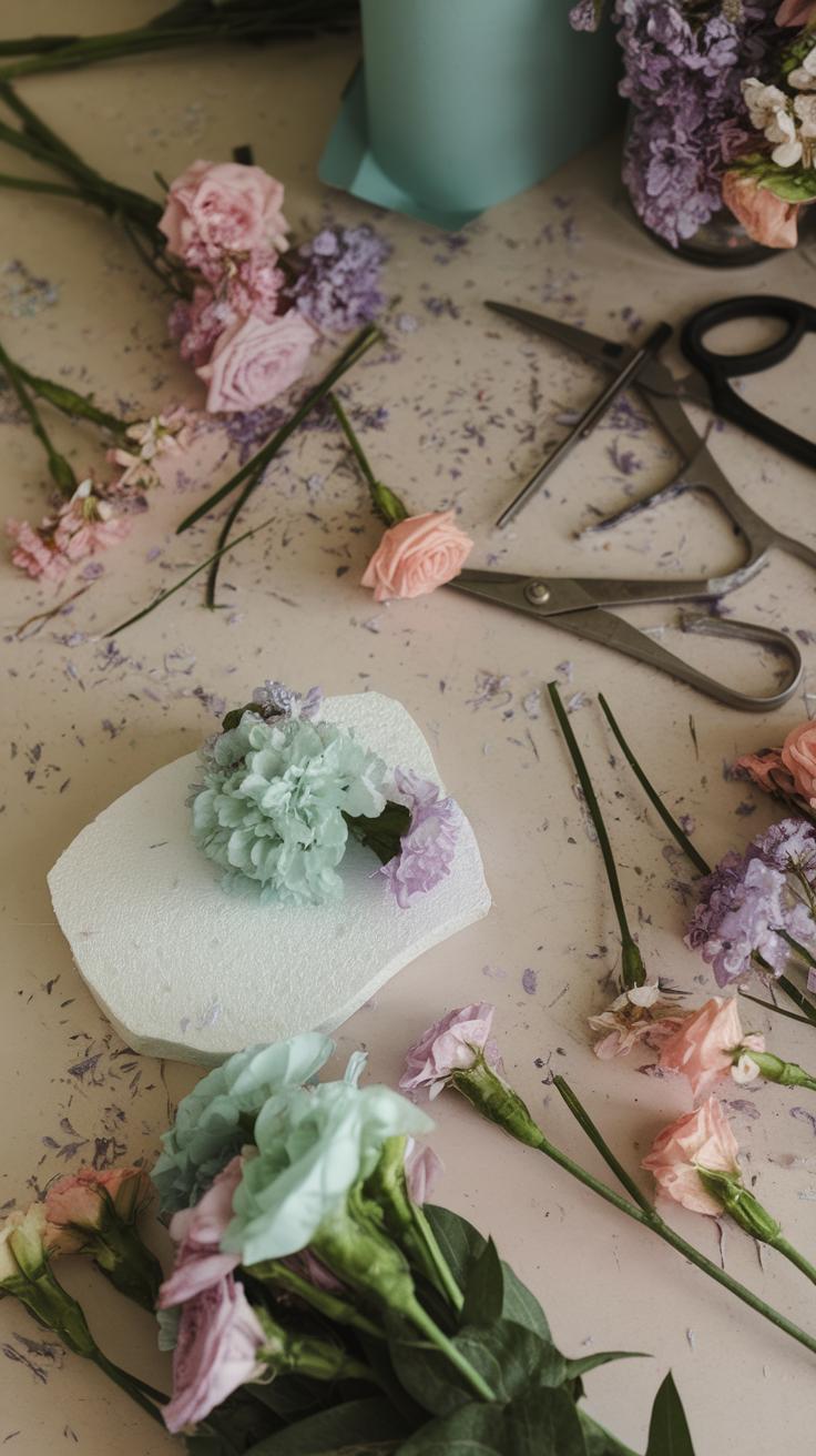 Choose a vase that fits your style. A clear glass vase highlights the colors of your pastel flowers. Start with a base of greenery, which provides structure and balance. Use stems like eucalyptus or ferns for a fresh look.