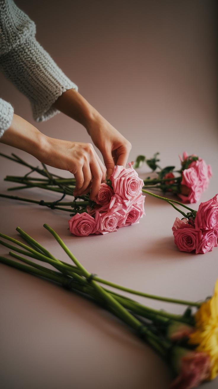 Grouping your flowers helps create a visually balanced arrangement. Consider placing flowers of the same variety together. Doing so draws the eye and creates clusters of color. You might group three or five roses in one section, making them a focal point while spreading other flowers around them for contrast.