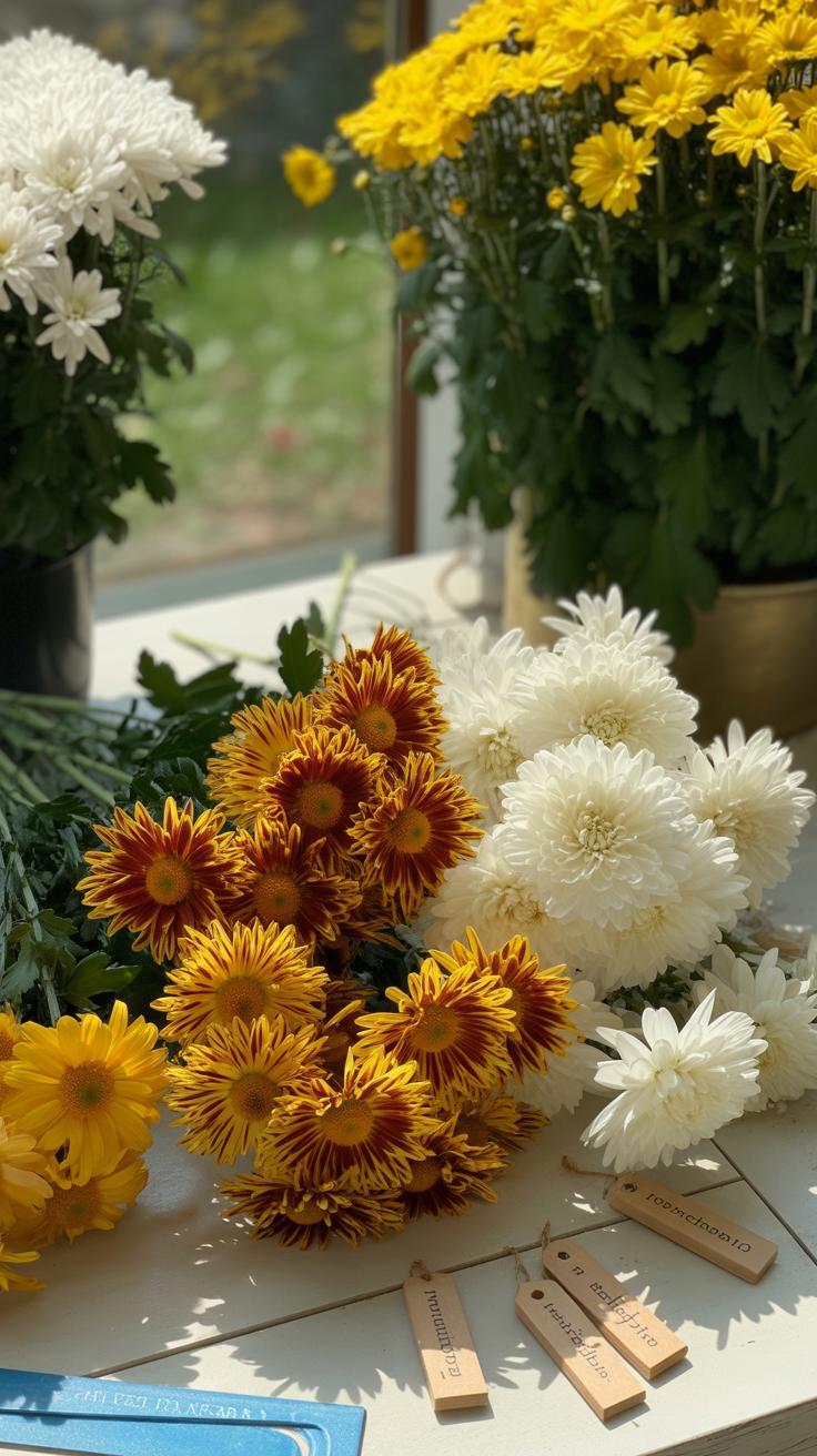 Try mixing different sizes and shapes. Chrysanthemums come in many forms—some round and full, others spiky or delicate. Placing them in layers adds depth. For instance, you could put flatter blooms closer to the glass, with more textured ones just behind, creating a subtle 3D effect.