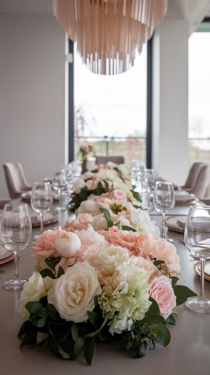 If you want a more dramatic effect, use tall vases or create a floral arch. This can be a stunning focal point in a room or at events. How about making a wall installation with hanging garden roses? This idea is perfect for adding a pop of color.