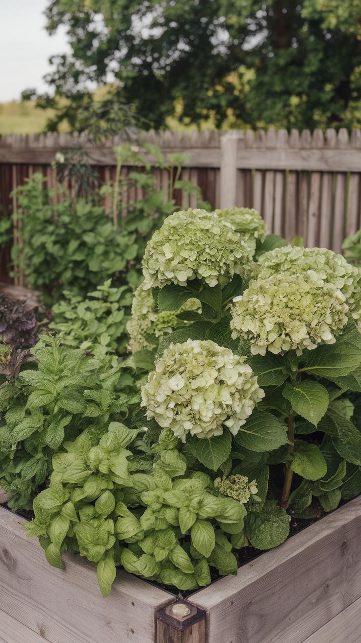Integrating Edibles with Green Hydrangeas