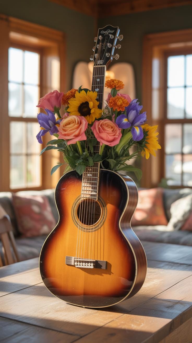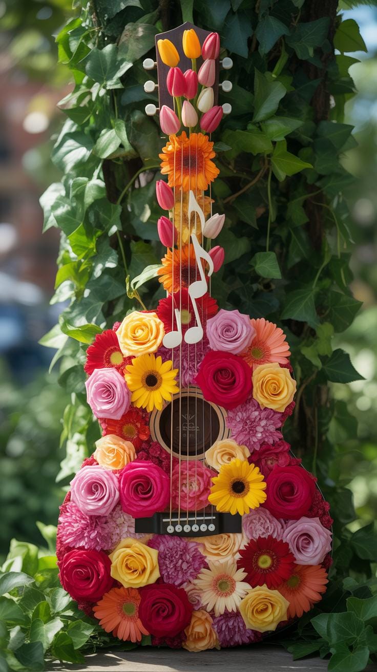 Position your floral arrangement with guitar theme near your acoustic instruments to create a sensory focal point. Placing a guitar flower arrangement on a wooden surface near a piano or speakers helps catch sound waves. These subtle vibrations move the petals and help distribute natural oils into the air. Guests will notice the scent more clearly when the music plays. This setup turns a simple room into a living musical flower design.