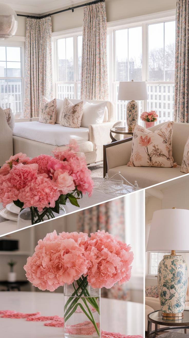 Brighten your living room with pink floral decor. Start by choosing a large floral mural or a statement wall art piece featuring pink blooms. It draws attention and sets a cheerful tone. Consider using floral throw pillows on your sofa. They offer a quick update without a major commitment. A pink floral area rug can tie the room together, adding warmth and comfort underfoot. Floral curtains can also soften the light that enters your space, creating a serene atmosphere.