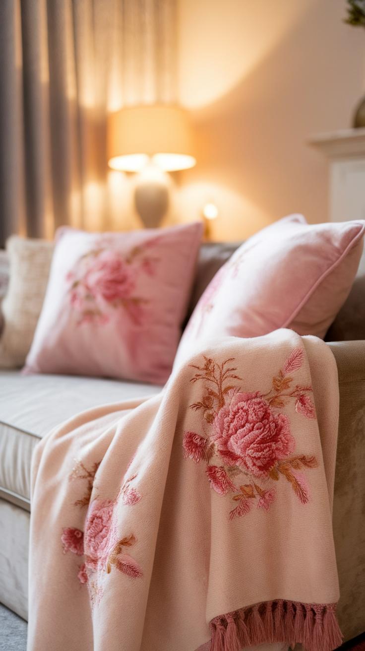Consider placing cushions on a neutral-colored sofa to highlight their floral designs. This contrast allows the pink patterns to stand out vividly. Throws displayed artfully across furniture add a cozy charm. You might also think about arranging cushions in a way that invites people to sit and enjoy your living space. How might your choices reflect your style? Use these elements to express your personality through floral decor.