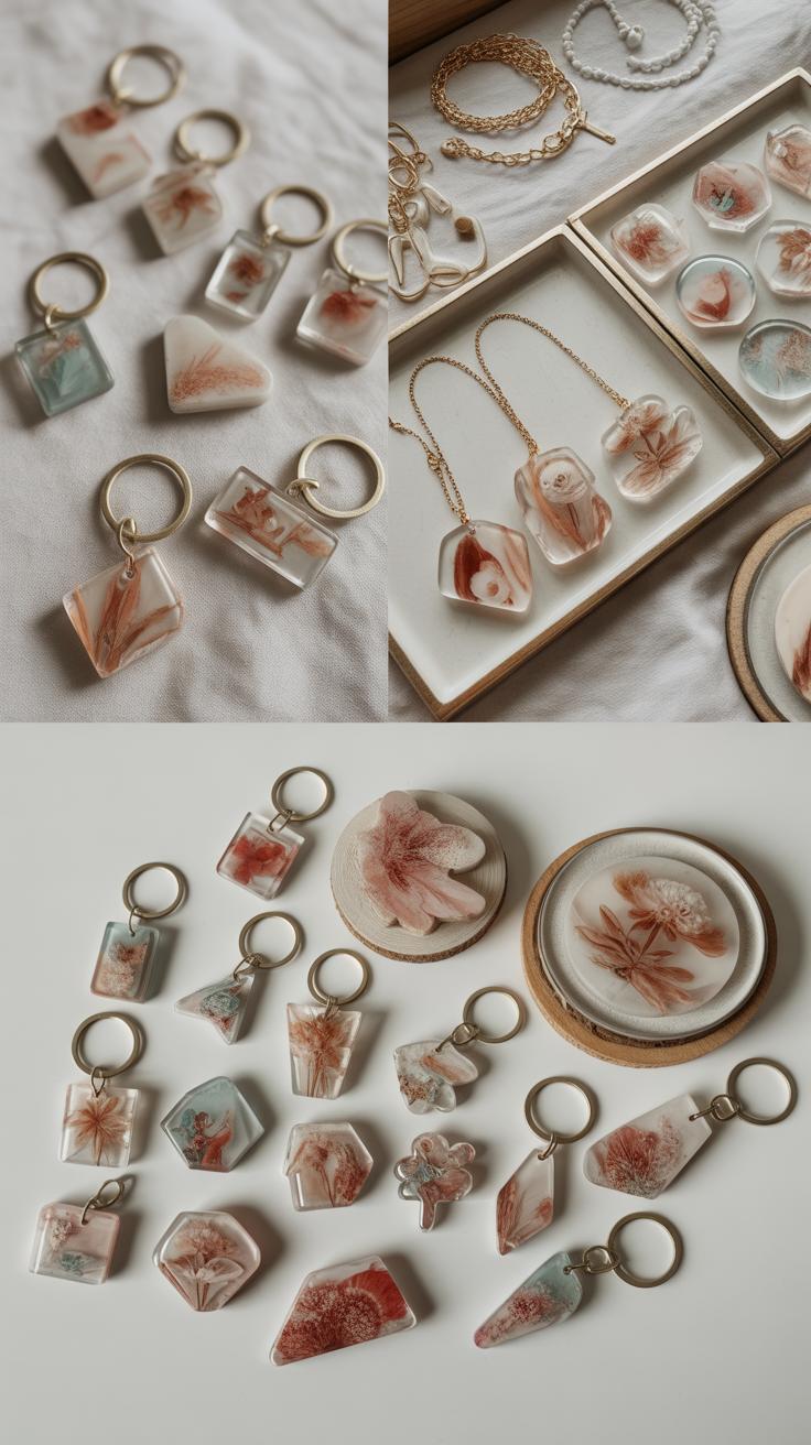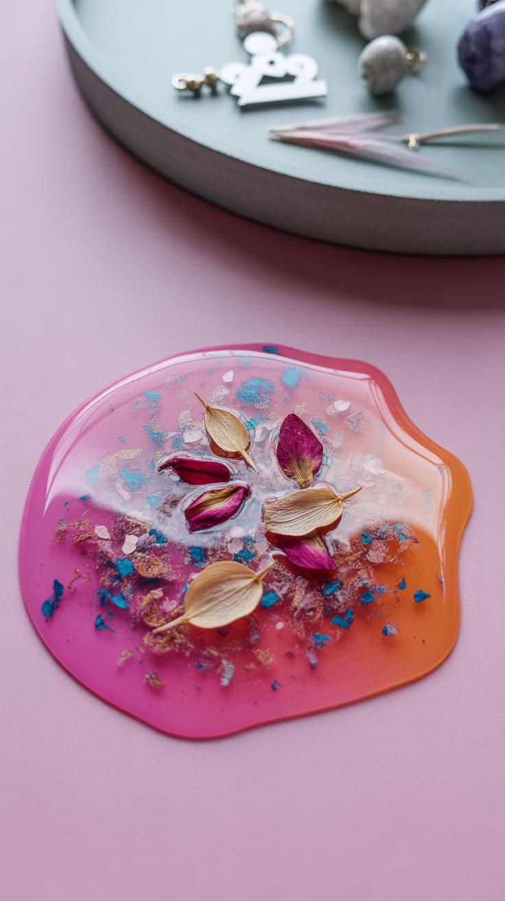 Add tiny decorations—think dried flowers, glitter, or small metal charms—arranging them carefully with a toothpick. Pour resin over to seal the pieces. You’ll want to cure in stages if layering colors or items.