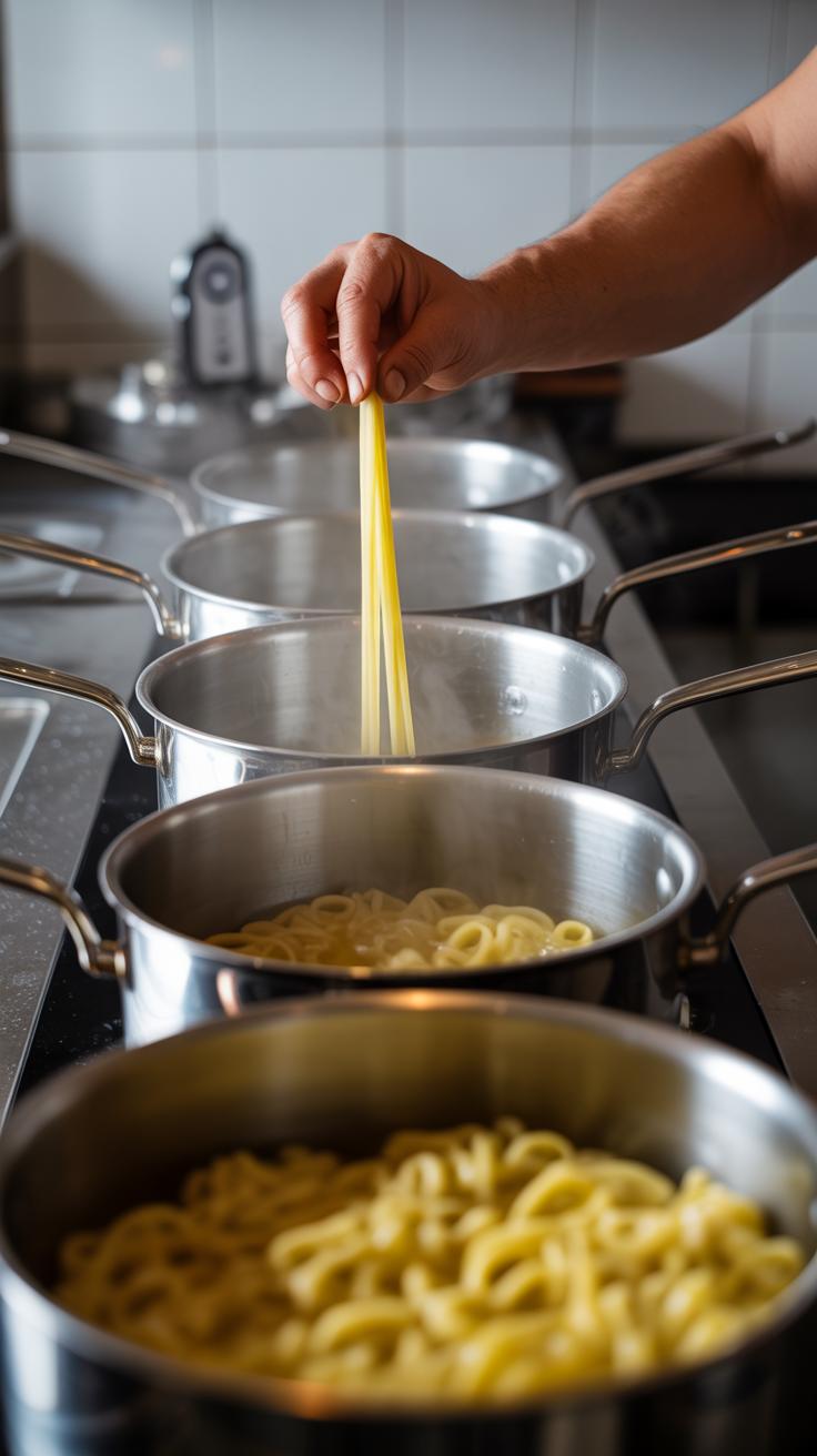 About halfway through, taste a piece. The ideal rigatoni offers a bit of bite—what Italians call al dente. Not crunchy, but still with a slight resistance when you chew it. I like to check a few times near the end to avoid overshooting.