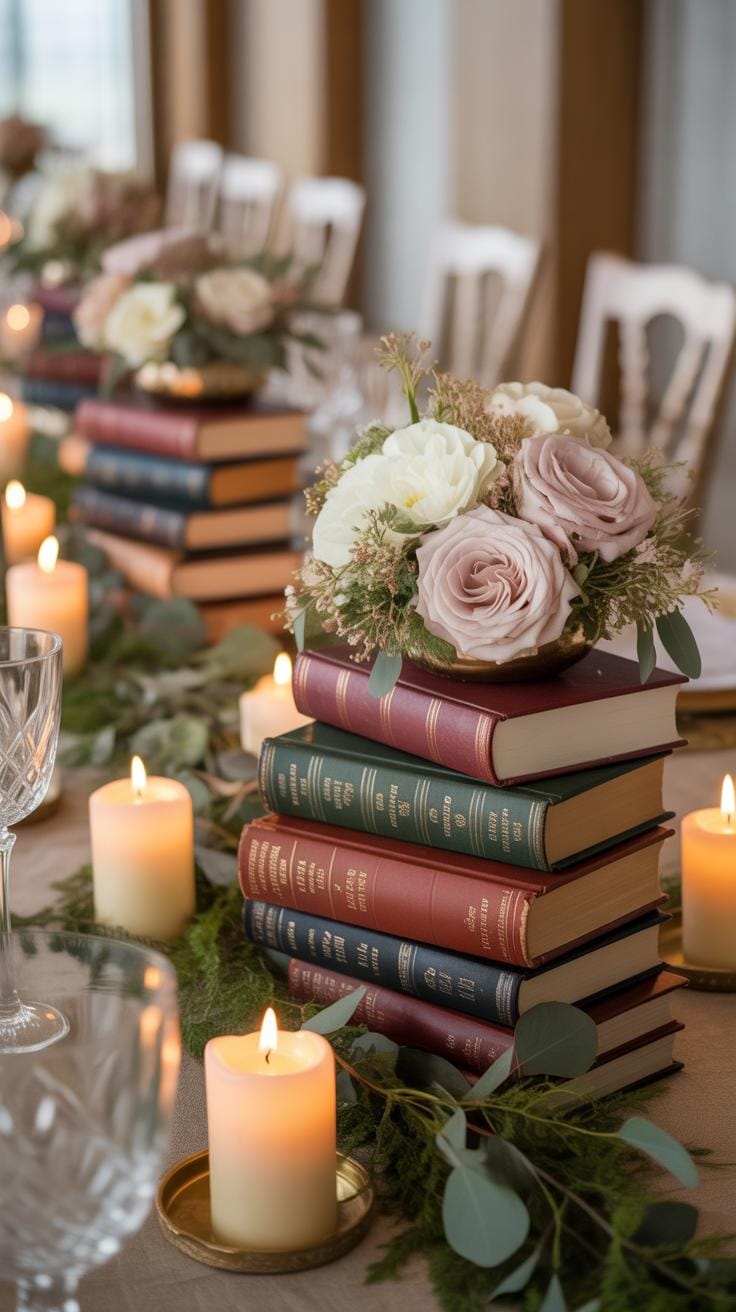 A Book Centerpiece Wedding needs a soft touch to balance the weight of old paper. You can place silk flowers inside glass vessels to frame your book centerpiece ideas perfectly. Orchids and calla lilies work best because they hold their shape under water or against solid objects. These flowers bring life to antique centerpieces while keeping the focus on the classic stories you choose for your display.