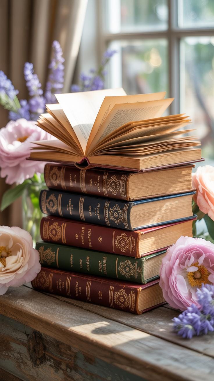 Vessels filled with water offer a unique way to display a Vintage Book Centerpiece. You can stack small, leather-bound books at the bottom of a wide glass cylinder. These books act as a sturdy base. Ensure the books are treated with a waterproof sealant or use decorative faux versions. This method creates height for other items like silk flowers or smooth river stones to sit upon.