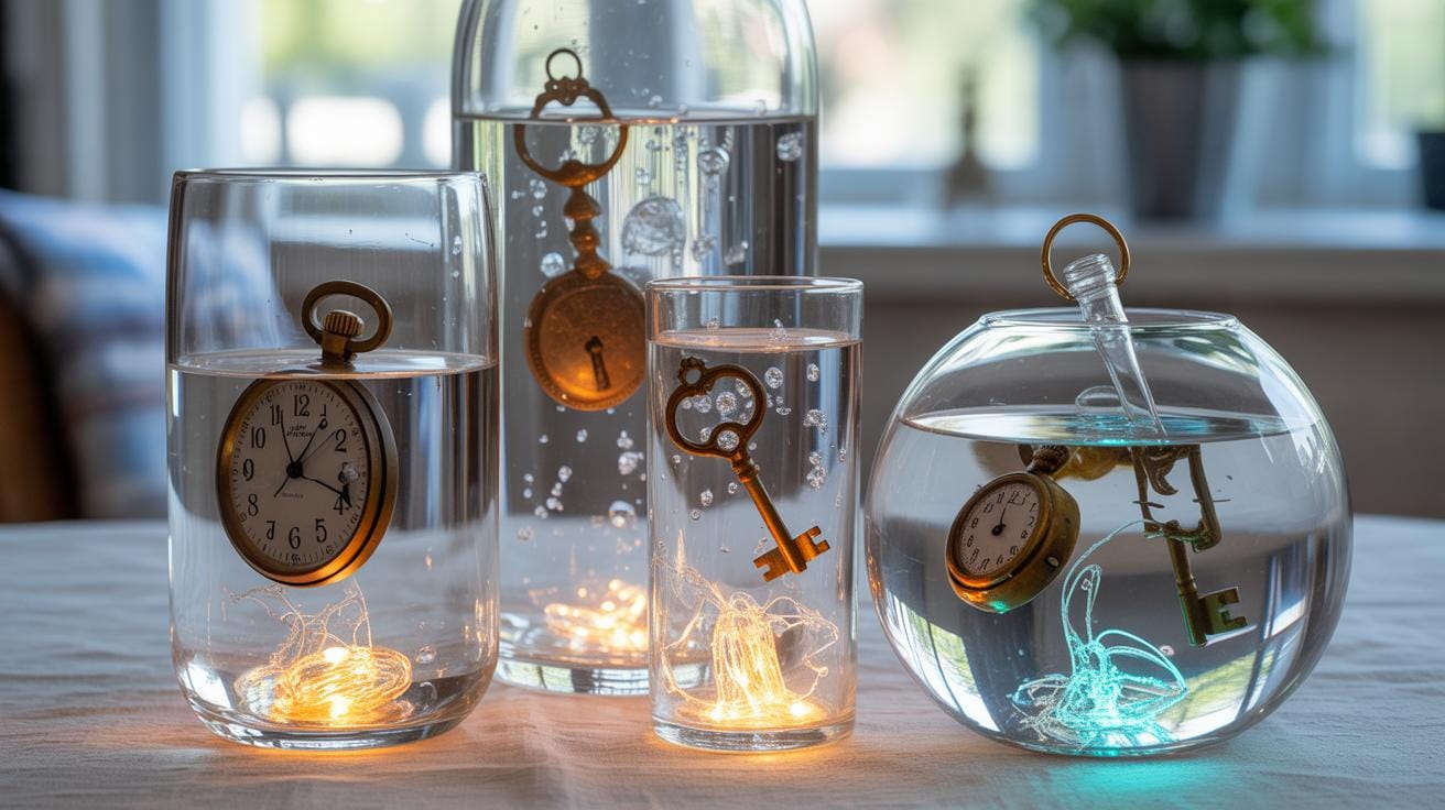 To successfully create sunken antique centerpieces, ensure your items are heavy enough to stay grounded. If an object is buoyant, use clear floral adhesive or thin fishing line to secure it to a decorative stone base. To protect the glass vessel, gently lower metal antiques using tongs rather than dropping them. Always clean your antiques thoroughly before submersion to prevent debris from clouding the water or affecting the LED glow.