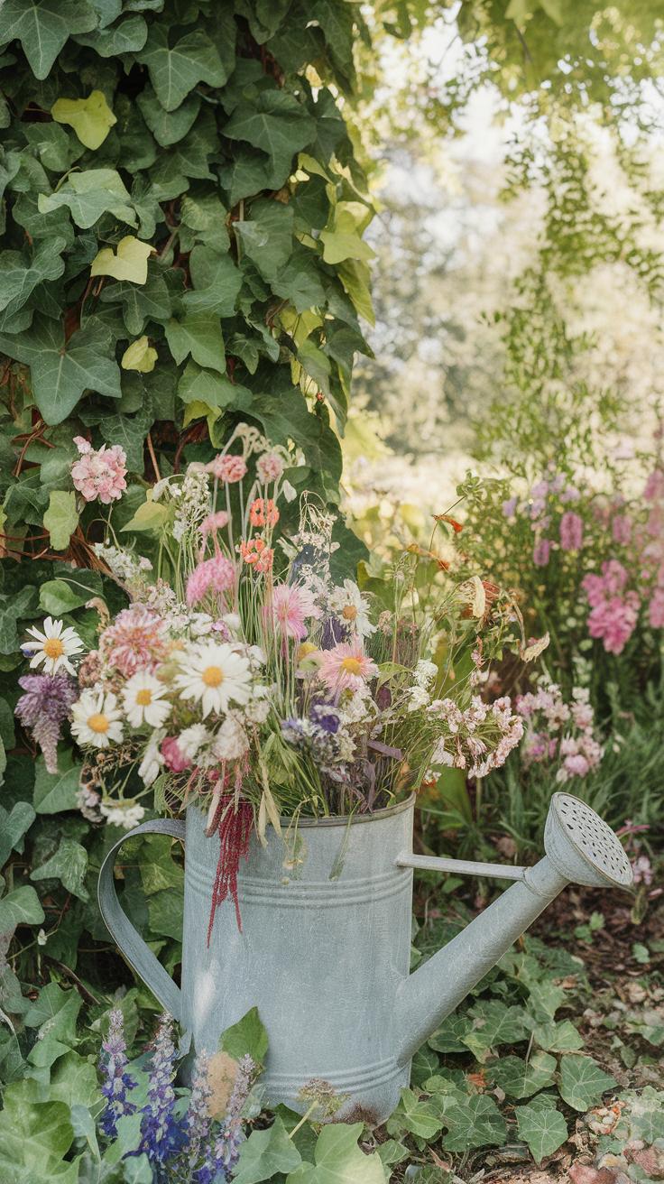 A whimsical garden arrangement captures the essence of nature. Use wildflowers and herbs to mimic an outdoor setting. Arrange colorful blooms like daisies, cornflowers, and clover alongside fragrant herbs such as mint and basil. Select a variety of sizes to add interest. Position taller flowers at the back and shorter ones at the front for visibility. Make sure the colors complement each other without clashing.